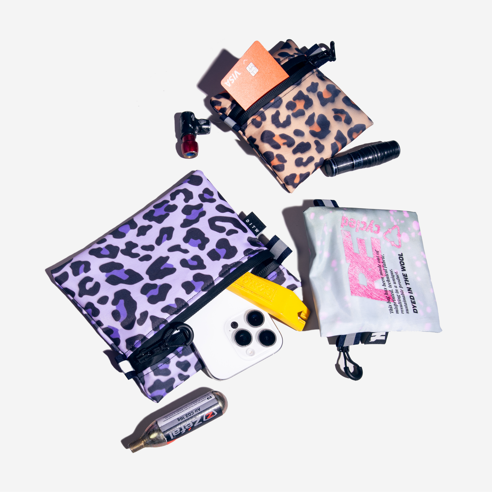 Trail wallet comes in 2 sizes, Mini and Medium. You can fit in it either an iPhone, your credit card, come coins, repair kit and many other bits and bobs.